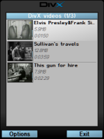 3. Start the DivX player on the phone and select Menu/ Browse Files any compatible files will appear in the File browser, Select the .avi you want and press the center key (or menu/ Play). The volume is usually set high and can be turned down with the navigation keys.